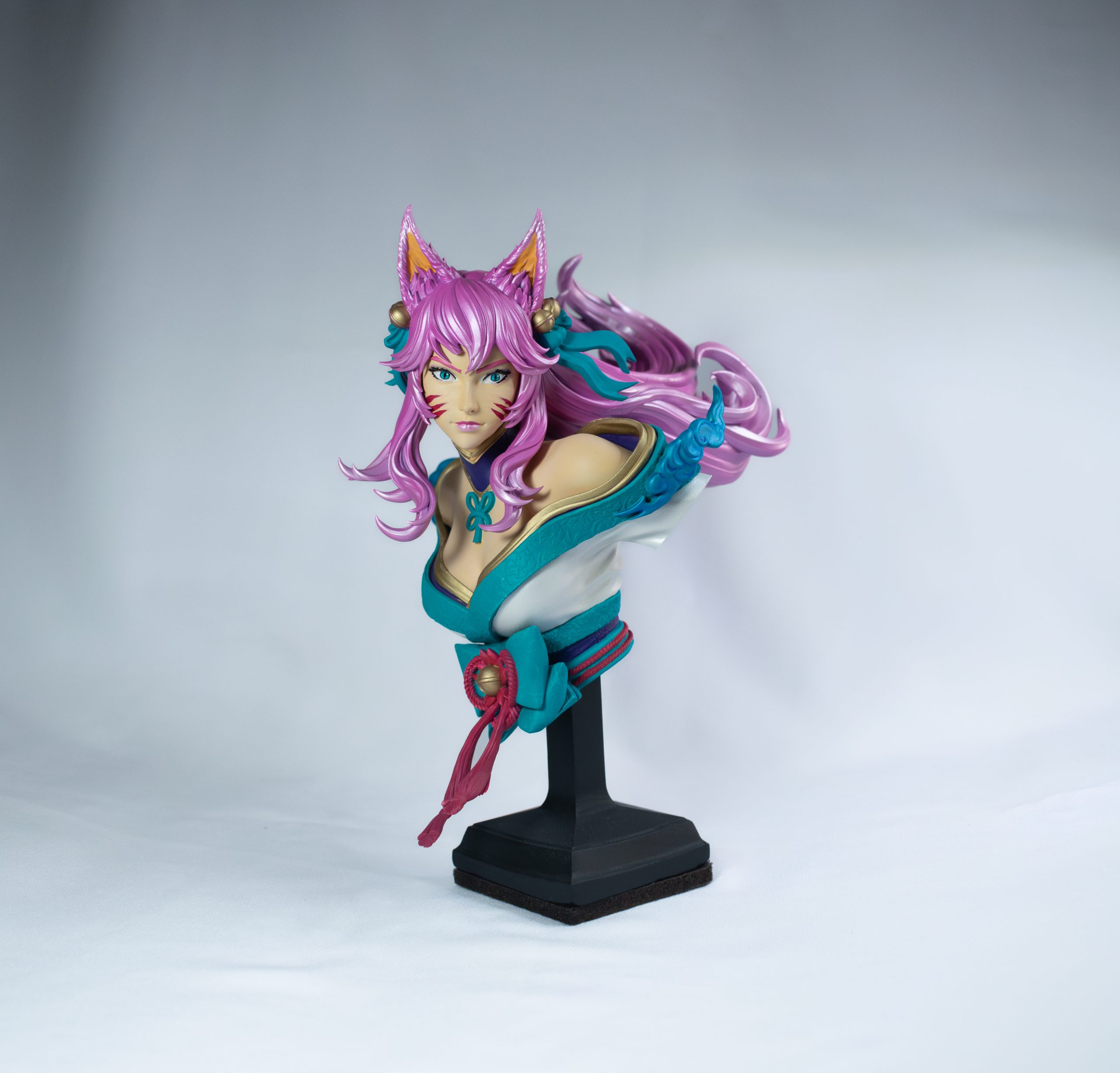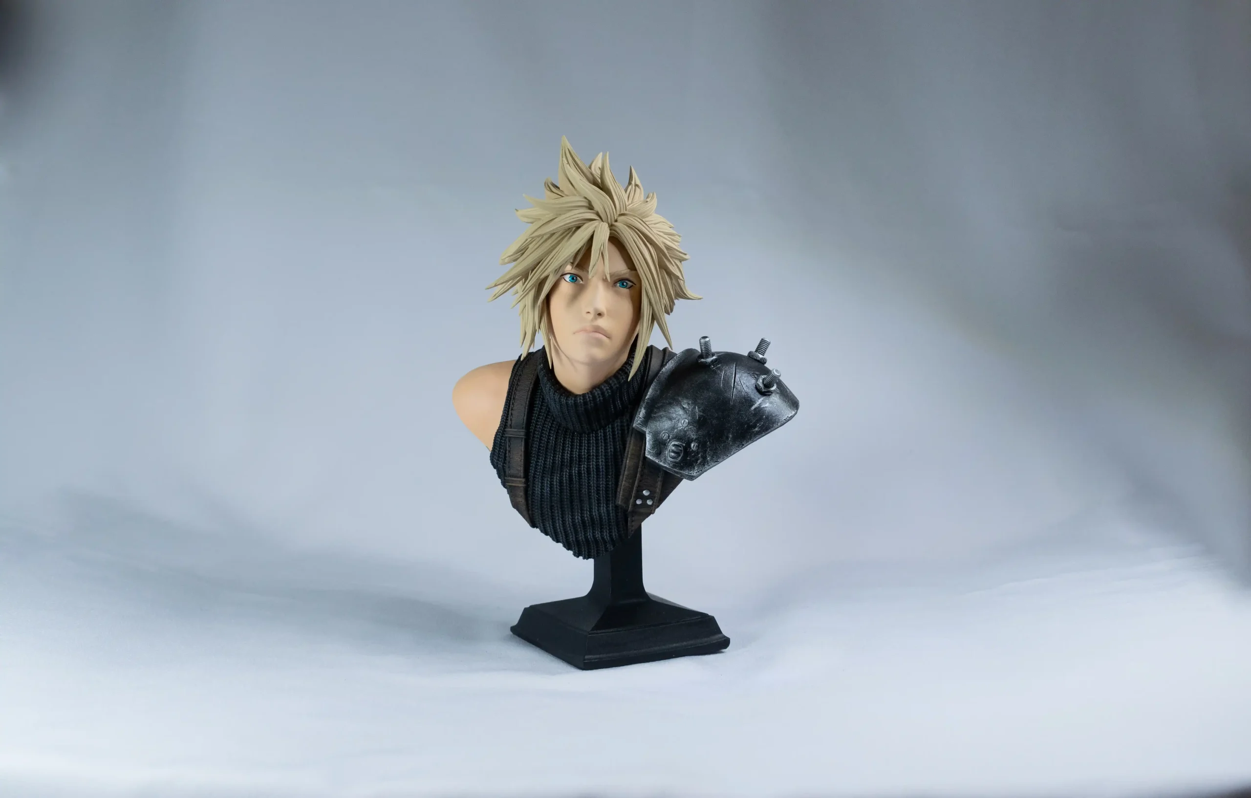 Busto de Cloud diseñado por NomNom. Impresion en resina. Pintado con spray, aerografo y pincel. Medidas. 15 cm. Tiempo estimado de creaciones de 2/3 semanas.