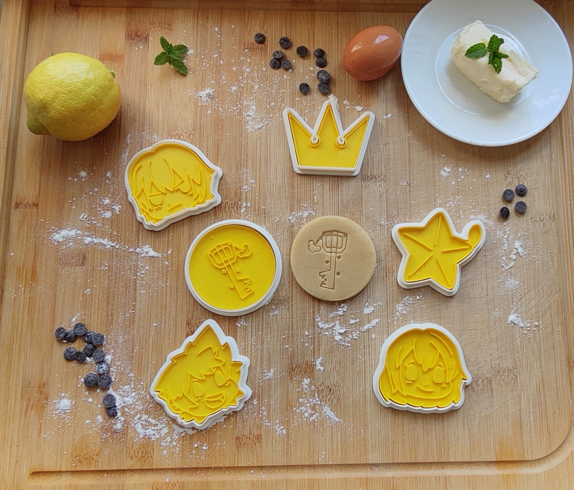 Cortadores de galleta de KingdomHearts. Impresion3d de filamento apto para uso alimenticio. Receta incluida. Set de 6 cortadores. Cada cortador tiene una medida aproximada de 10cm. El color de los cortadores es aleatorio. Tiempo estimado de creaciones de 1/2 semanas.