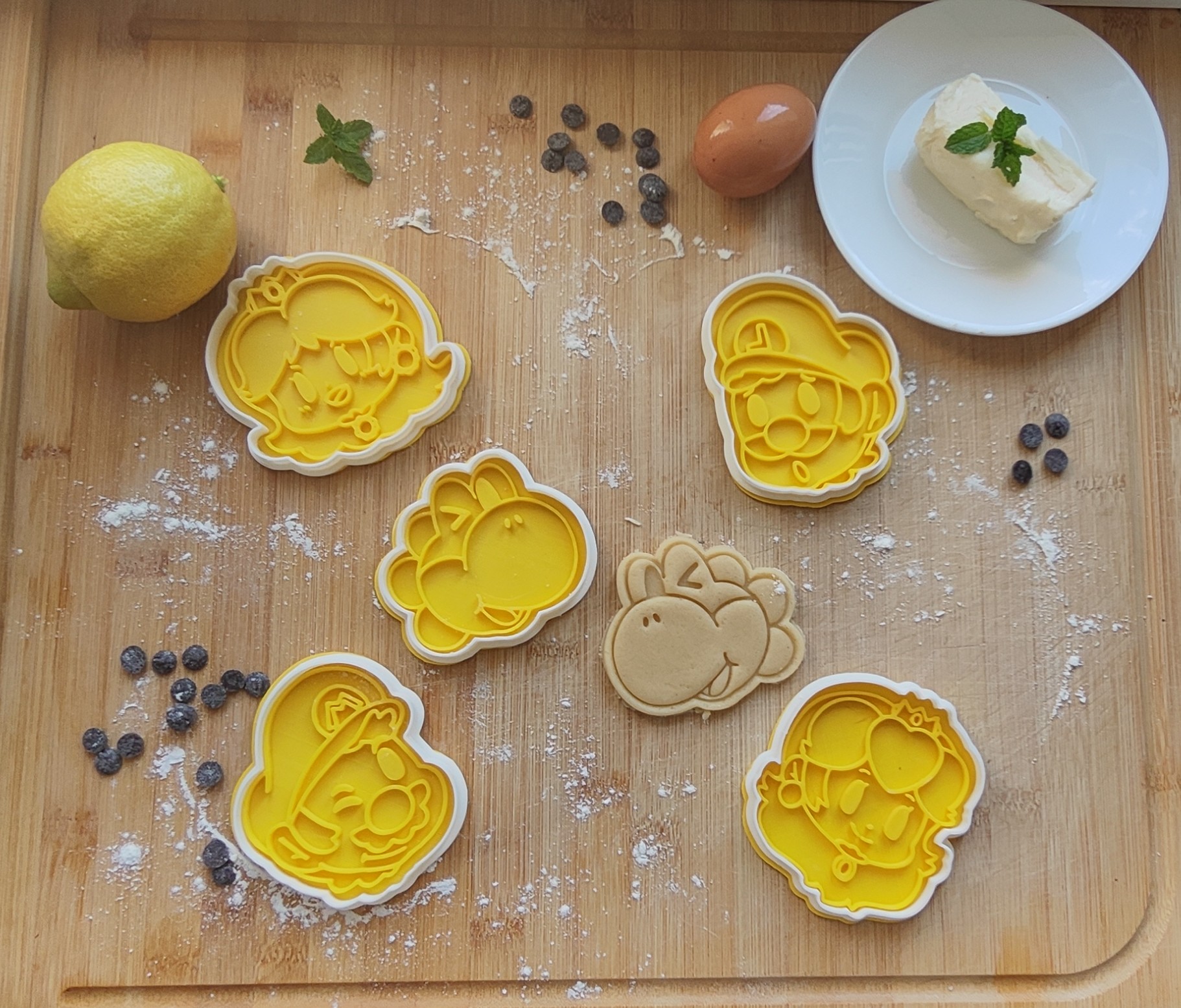 Cortadores de galleta de SuperMario. Impresion3d de filamento apto para uso alimenticio. Receta incluida. Set de 5 cortadores. Cada cortador tiene una medida aproximada de 10cm. El color de los cortadores es aleatorio. Tiempo estimado de creaciones de 1/2 semanas.